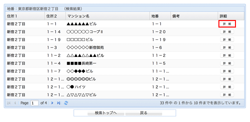 新宿区内の「▲▲▲▲▲▲マンション」の一覧が表示されますので、詳細をクリックしてください。